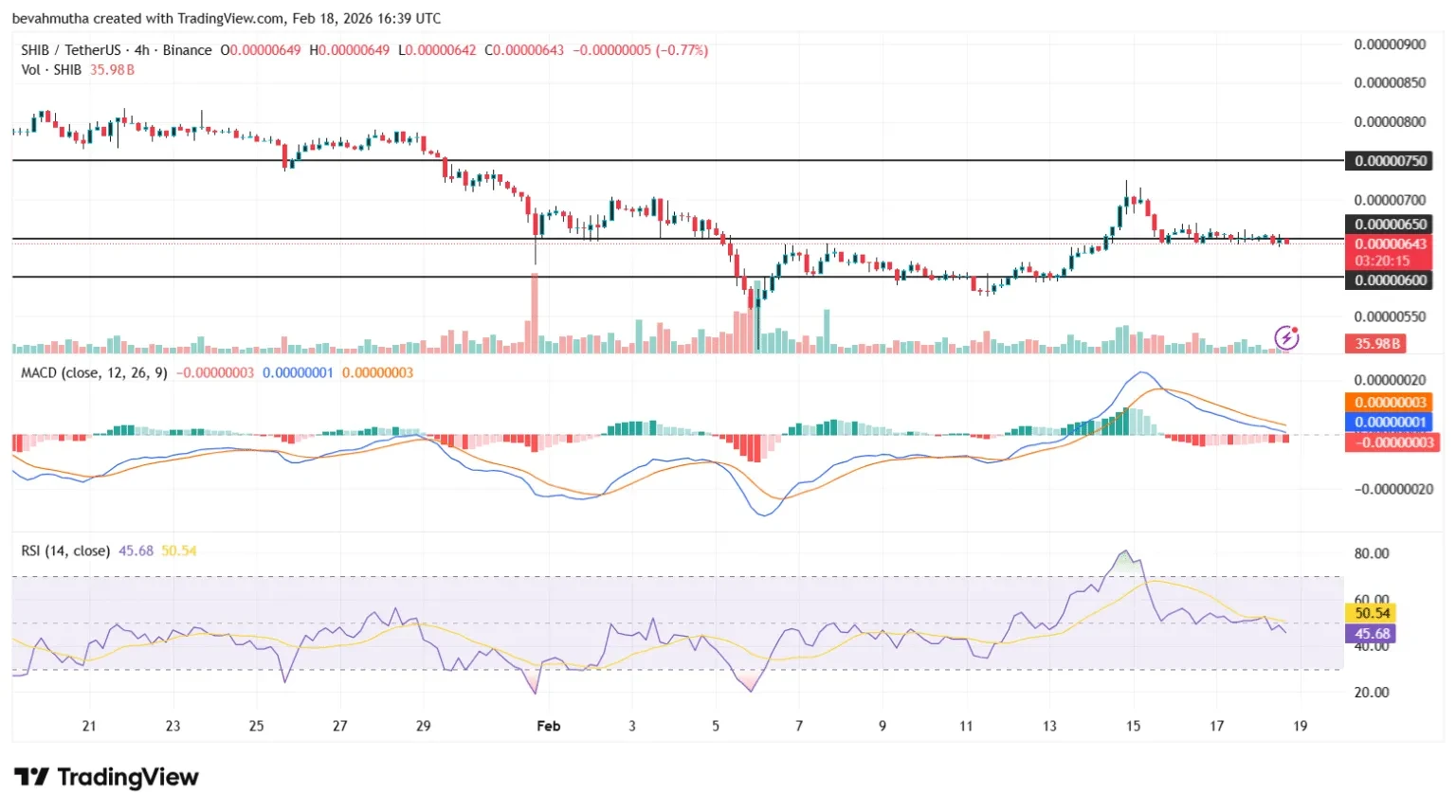 From a technical standpoint, $SHIB is consolidating between established levels. Support holds near $0.00000600, while resistance sits at approximately $0.00000750. The token has been moving within this range for several days without a decisive break in either direction.