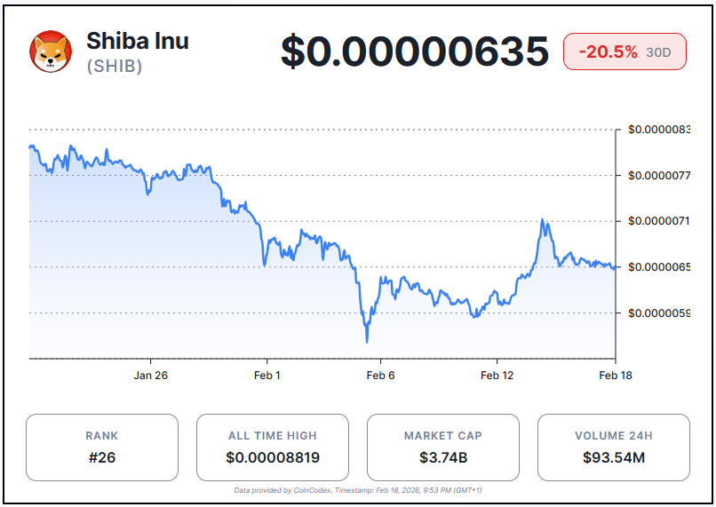 Shiba Inu continues to trade under pressure, failing to break above the $0.000006476 resistance level. The token dropped 3.20% in the last 24 hours, compounding a 20.5% decline over the past month. Despite a modest 8.8% weekly recovery, $SHIB remains near its lowest levels in recent months.