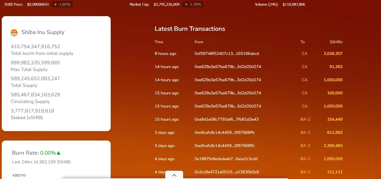 Token burns have not provided meaningful relief. Only 4,382,109 $SHIB tokens were burned in the most recent 24-hour period. Given $SHIB's total circulating supply running into the hundreds of trillions, that figure is negligible.