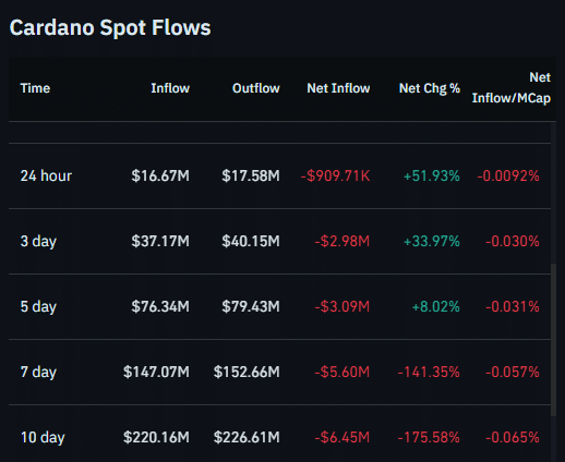 On-chain data from Coinglass shows that Cardano has seen good spot buying activity in the past few days. The spot flows show higher outflows than inflows on higher timeframes, signaling accumulation over further distribution.