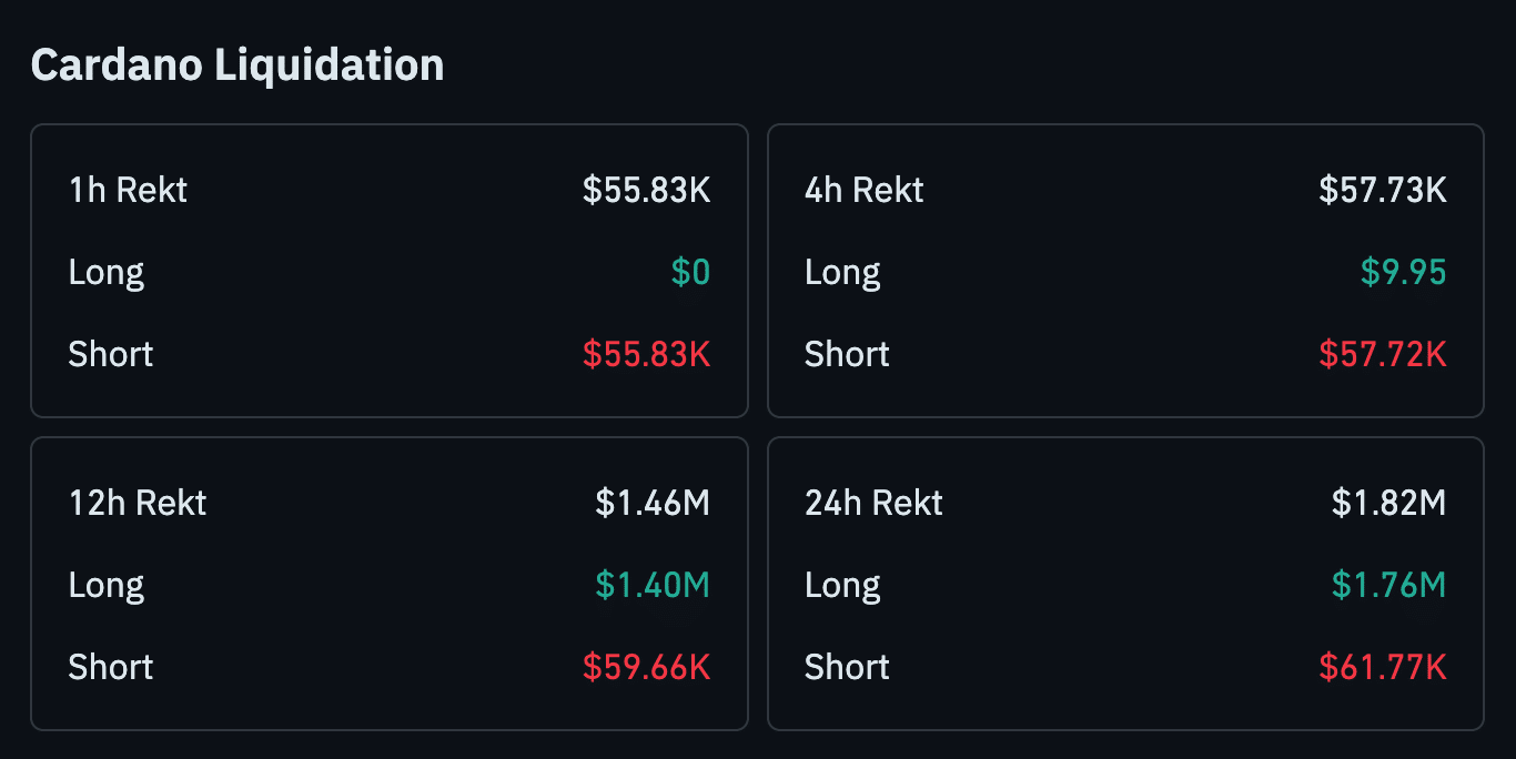 Cardano derivatives data reveals a clear shift in market pressure. Short-term liquidations (1h and 4h) total $56K–$58K, almost entirely from short positions ($55.83K in 1h and $57.72K in 4h).