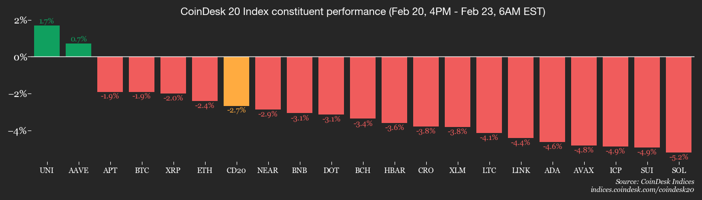 - Uniswap DAO is voting to enable protocol fees across all V3 pools and eight layer-2 networks. Voting ends Feb. 23.