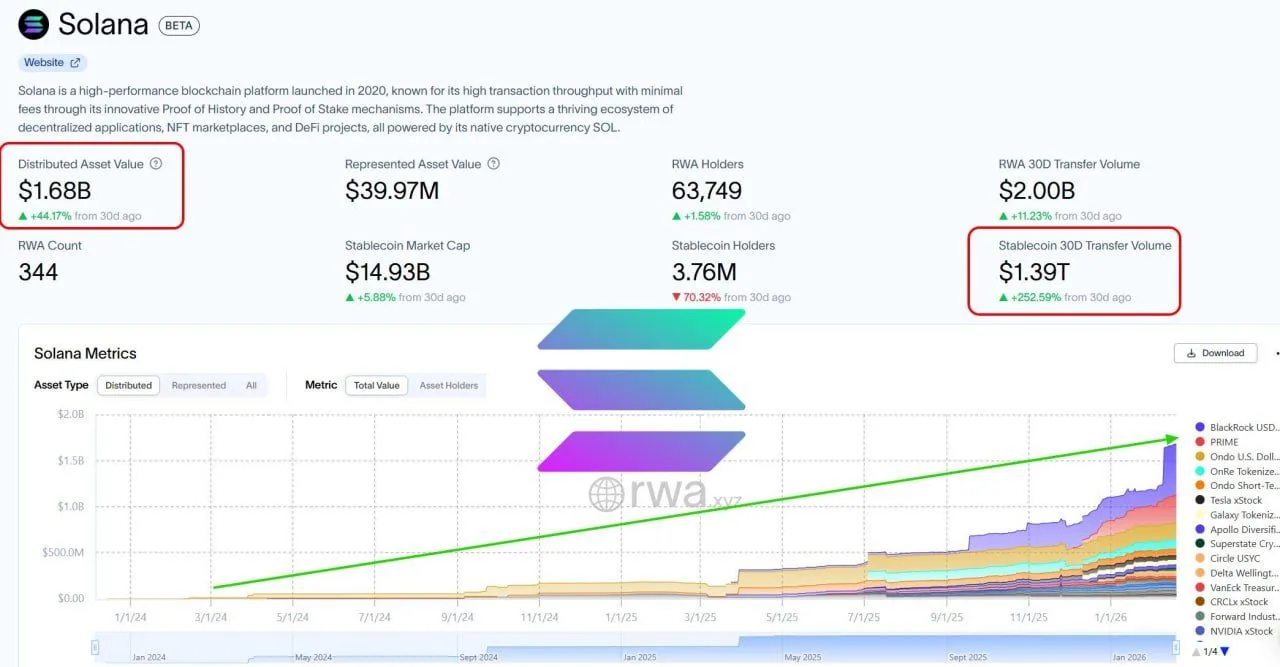 Meanwhile, Solana’s real-world asset footprint expanded in February, with dashboard data showing $1.68 billion in distributed asset value, up 44.17% over the past 30 days. The update reflects rising issuance and usage of tokenized assets on Solana, while onchain transfer activity accelerated over the same period.