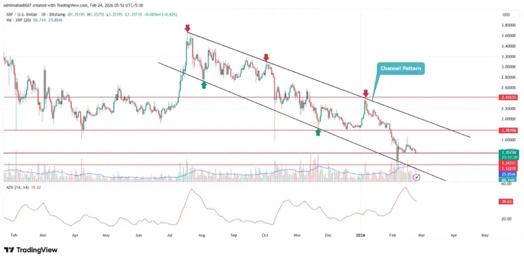 On Monday, the $XRP price slipped another 2.2% to reach its current trading value of $1.36. The primary trigger to this fall was macroeconomic uncertainty, as the U.S. president raised global tariffs from 10% to 15% while the Supreme Court ruled tariffs illegal just last week. The falling $XRP value pushes the asset deeper below its realized price, which historically bolstered strong contraction in market trend.