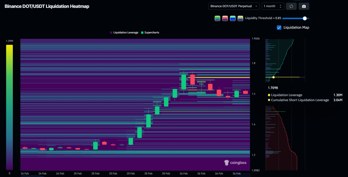 The liquidation heatmap reveals a significant cluster of short positions near $1.70. Approximately $1.30 million in short liquidations are concentrated at this level. A decisive breakout could trigger total short liquidations worth $3.04 million. Such forced buying may accelerate price gains.