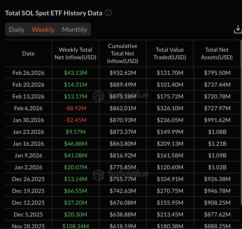 Against all of this, one data point stands in contrast. Solana spot ETFs maintained positive weekly inflows throughout February, even as Bitcoin and Ethereum ETFs collectively bled. In the week ending February 20, $SOL ETFs absorbed $14.31 million. By the week ending February 26, that figure had tripled to $43.13 million — the highest weekly inflow of the month.