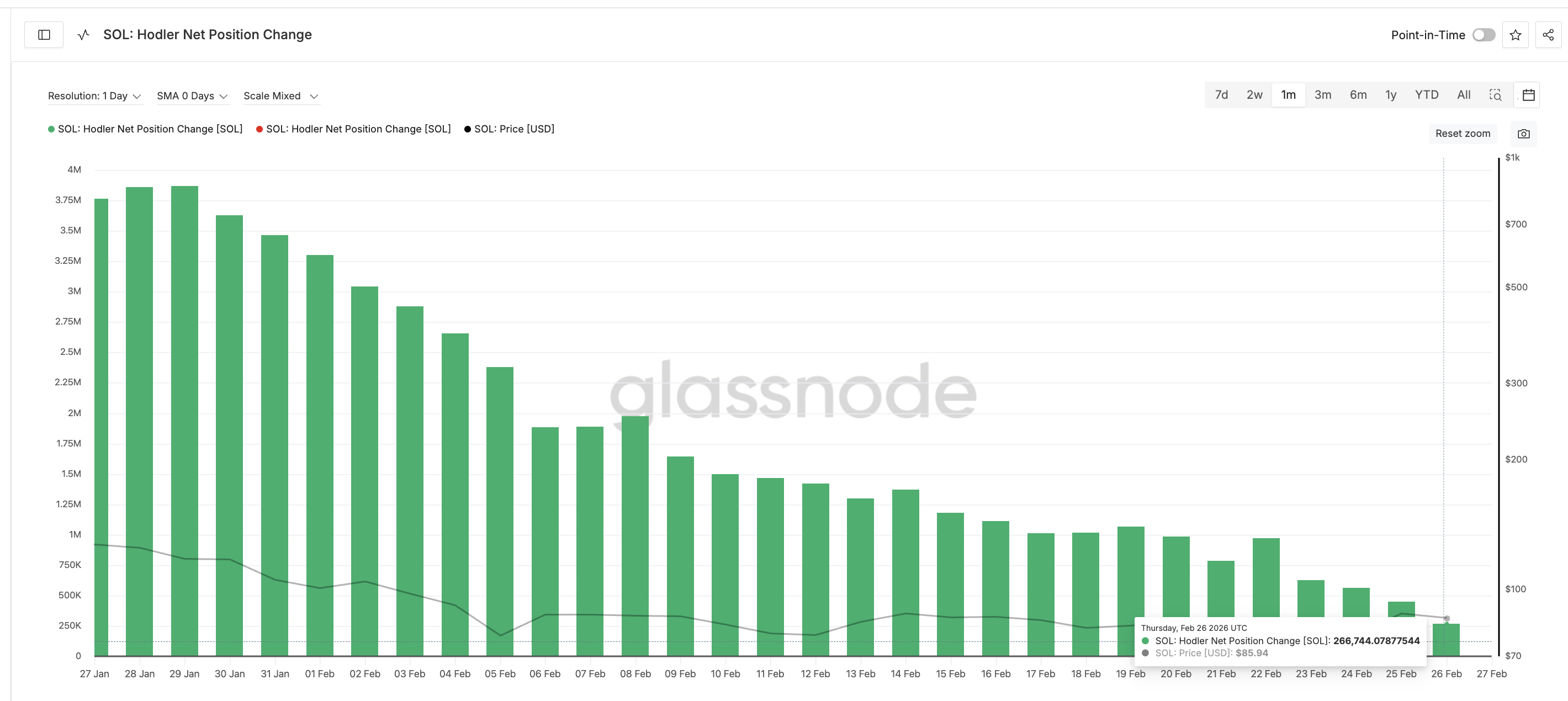 Long-term conviction holders tell the same story from the other side. The Hodler net position change metric — a measure of accumulation by longer-term wallets — peaked in late January (near the pattern breakdown) around 3.47 million $SOL on a 30-day rolling basis. By February 26, it had collapsed to just 266,744 $SOL — a 92% decline and the monthly low.