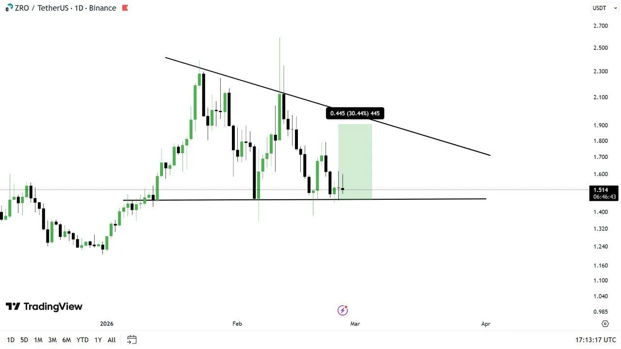 From the technicals, $ZRO’s daily chart shows a bullish pennant formation following a prior breakout. Price now consolidates within a tightening range between $1.49 and and the descending trendline of the wedge after establishing a local bottom inside that structure.