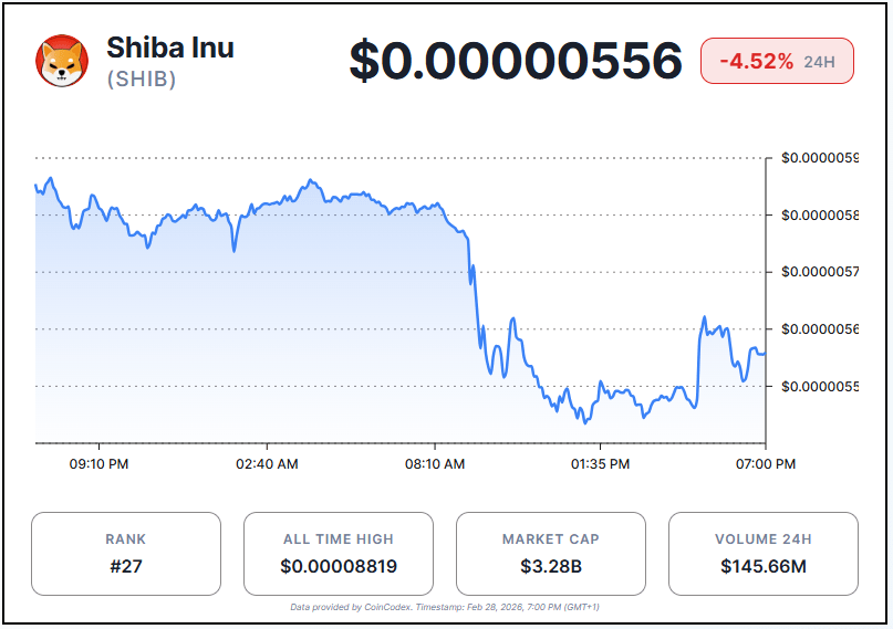 Shiba Inu extended losses on Saturday, hitting an intraday low of $0.00000544 amid intensified selling pressure in cryptocurrency markets. The move came after $SHIB briefly tested the $0.00000555 level, a point that failed to hold as bearish momentum picked up across digital assets. At press time, $SHIB was trading at $0.00000556, down 4.52% over the last 24 hours.