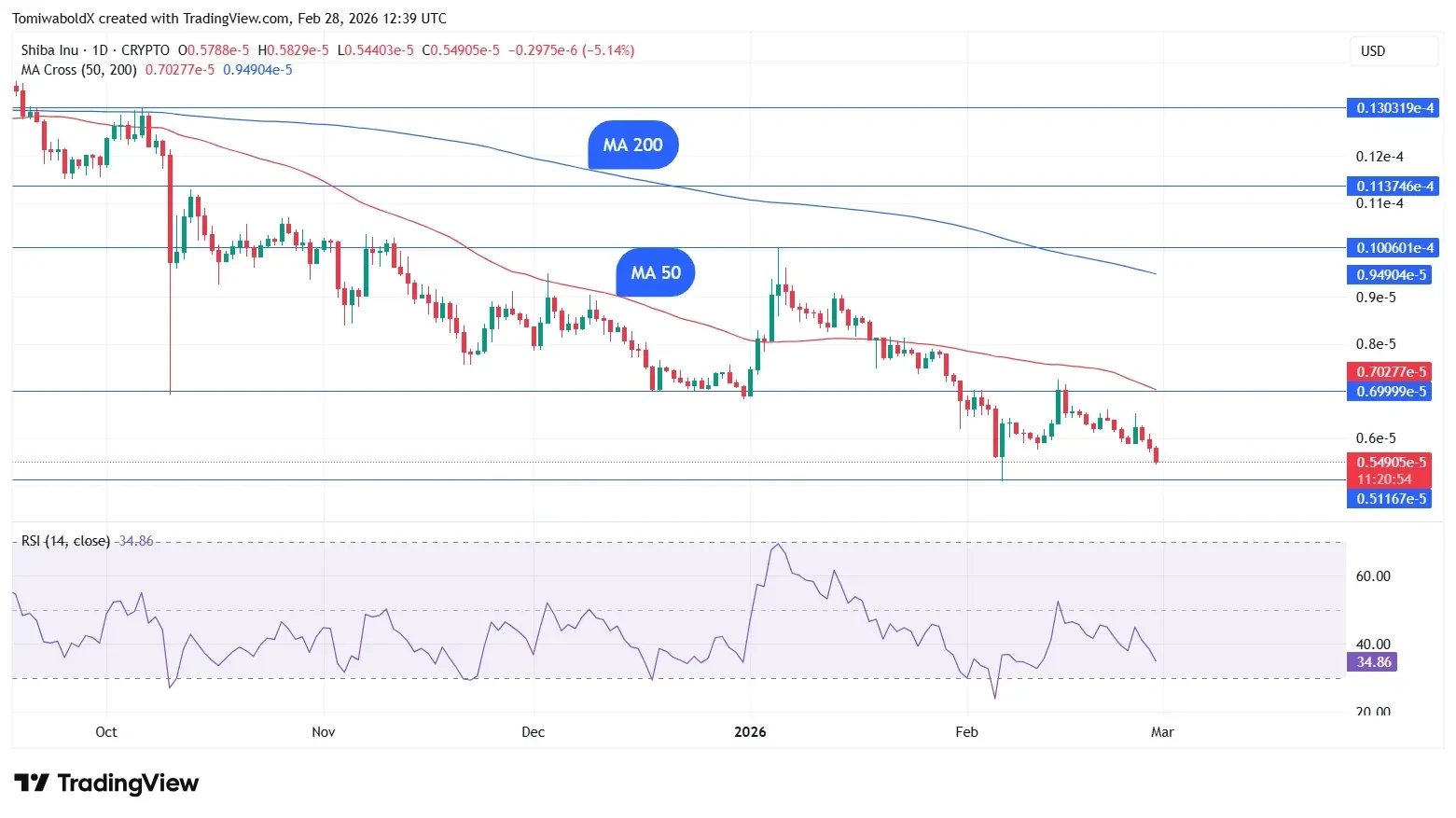 From a technical standpoint, $SHIB's Relative Strength Index (RSI) has dropped below 30 on several lower time frames. That threshold typically indicates an oversold condition. When RSI falls into this zone, a relief rally or, at a minimum, a short-term bounce becomes a statistical probability. Traders refer to the latter scenario as a "dead cat bounce", a brief recovery within a sustained downtrend.