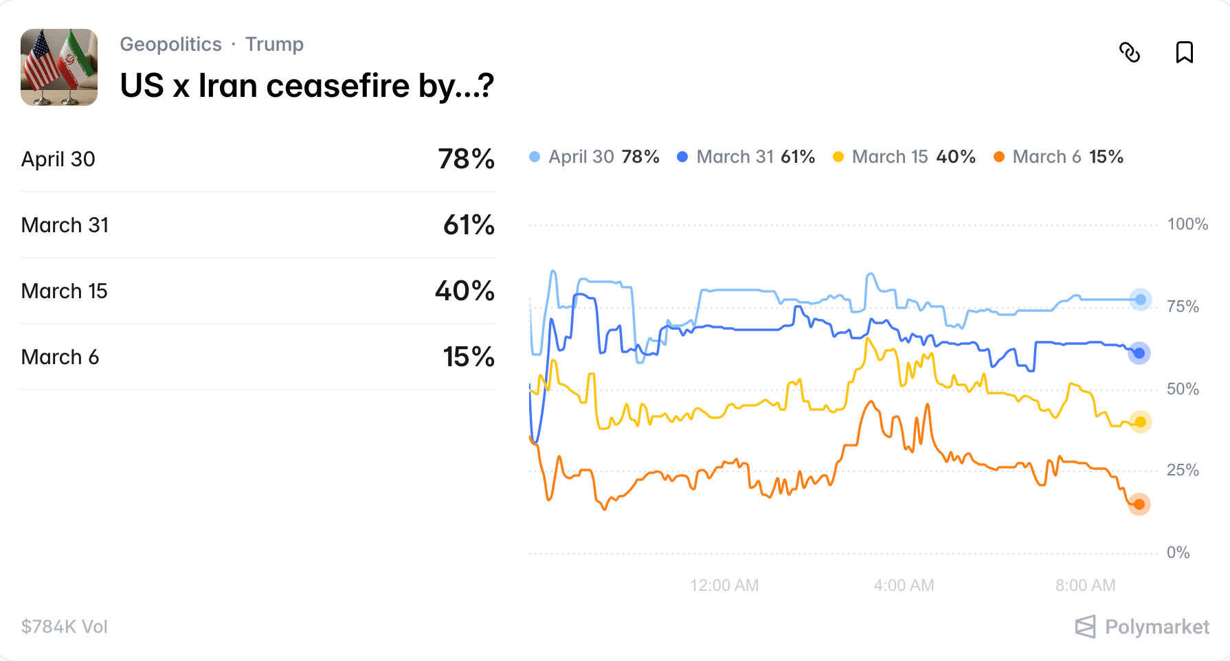The ceasefire market gives just a 4% chance of a U.S.-Iran ceasefire by March 2 and 15% by March 6, but jumps to 61% by March 31 and 78% by April 30. Bettors are pricing a resolution within weeks, not months, consistent with bitcoin's bounce to $68,000 on the same thesis.