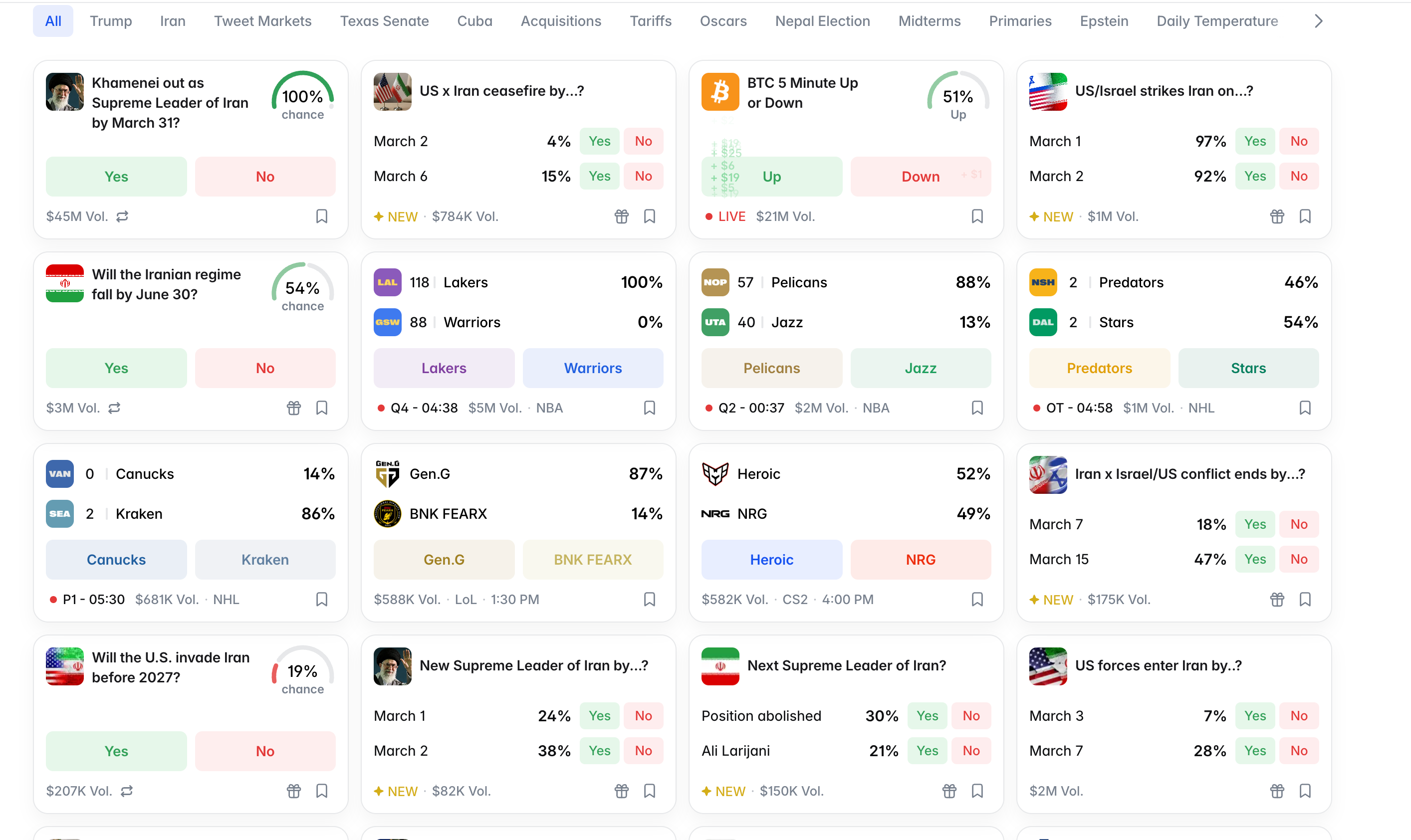 Polymarket's largest completed market is "Khamenei out as Supreme Leader of Iran by March 31?" which resolved to 100% after Iranian state TV confirmed his death.