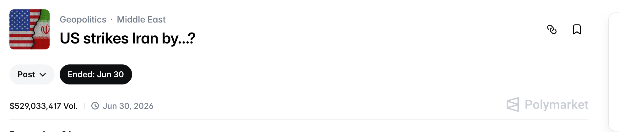 The biggest market, however, is the "US strikes Iran by...?" contract, which has been live since December 22 and has now pulled $529 million in total volume, making it one of the largest single markets Polymarket has ever hosted.