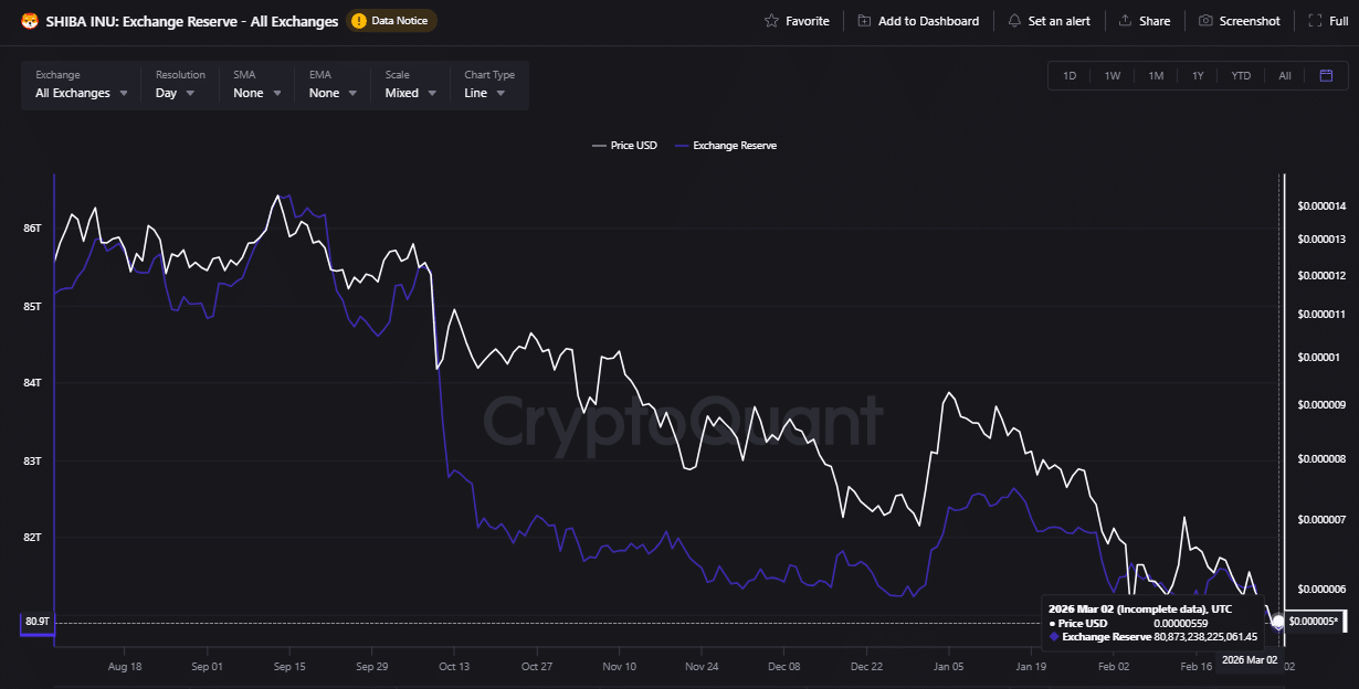 CryptoQuant data confirmed this spike over the weekend, as holders appeared to be repositioning. $SHIB reserve on exchanges suddenly spiked from 80.93 trillion on February 27 to 81.06 trillion on February 28.