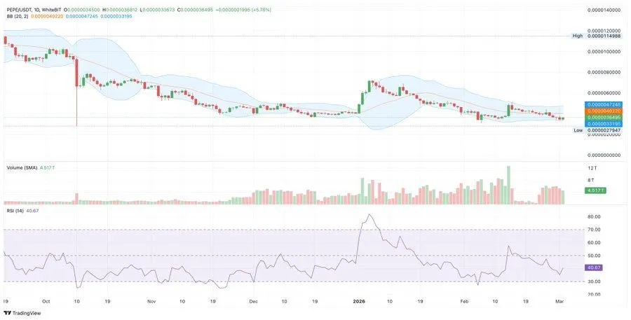 The 20-day moving average near $0.0000004022 remains the first key resistance. $PEPE must reclaim this level to regain short-term momentum. A strong breakout could open the path toward $0.0000004724. That level may confirm a broader trend shift. RSI sits near 40.6 and shows recovering momentum. The indicator still has room before reaching overbought levels. Volume remains steady near 4.5T. This suggests gradual accumulation rather than panic selling.