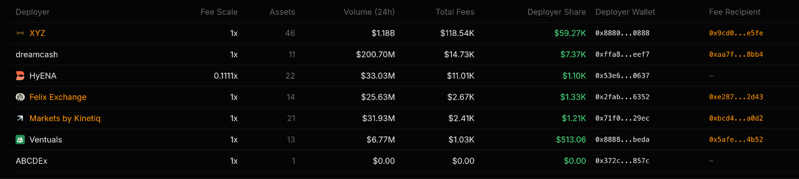 - Markets.xyz: Launched by the Kinetiq team (a Hyperliquid liquid staking project) in mid January 2026, Markets focuses on global equity indices and macro assets. A key differentiator is its use of $USDH as collateral, which reduces trading fees and increases rebates, allowing it to compete on cost (20% lower taker fees, 50% better maker rebates and 20% more volume contribution toward fee tiers)