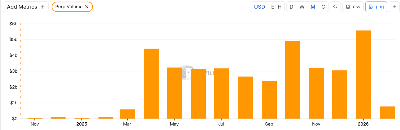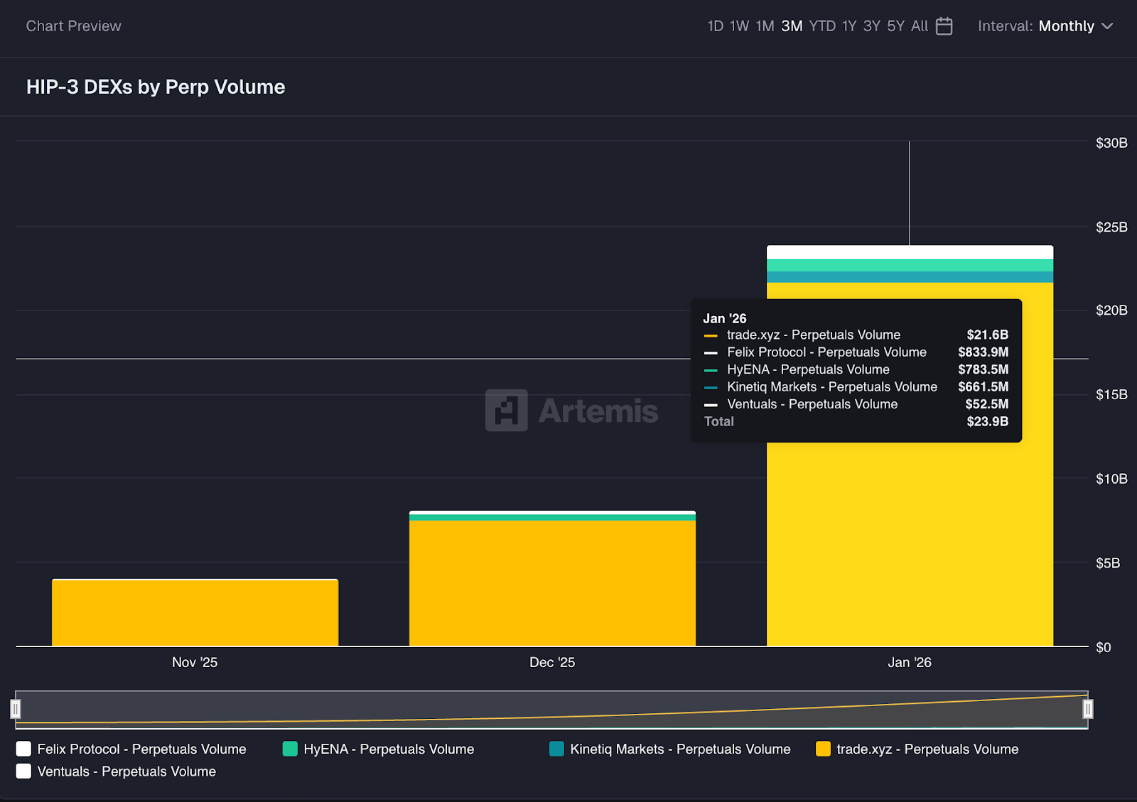 - Trade.xyz: A leading RWA perp DEX within the HIP-3 ecosystem developed by HyperUnit which is an asset layer team partnered with Hyperliquid. Trade.xyz emphasizes 24/7 trading for U.S. equities and other traditional assets. It initially launched the XYZ100 perpetual, which tracks the Nasdaq-100 index, alongside several U.S. tech leaders. By late January 2026, Trade’s monthly volume had grown to over $21 billion, up nearly 10x from around $2 billion in November 2025. Currently, Trade.xyz leads all HIP-3 perpetual venues by a significant margin, contributing around 90% of the total market volume.