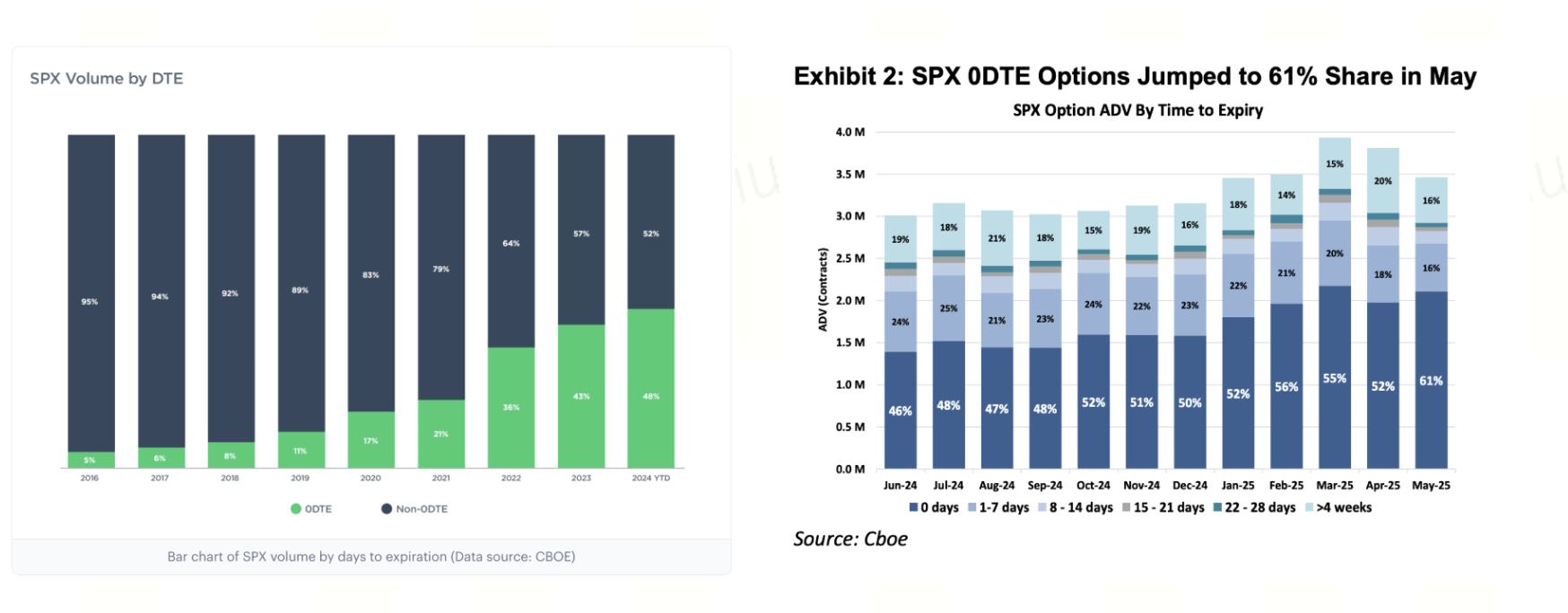 Figure 1: The two charts above show the proportion of S&P 500 index options with different expiration times from 2016 to 2025. We can see that 0DTE options accounted for only about 5% of the options market in 2016, but by 2025, their market share has surged to 61%. This indicates that nearly half of all S&P 500 index options trading now consists of ultra-short-term bets on the same day direction.