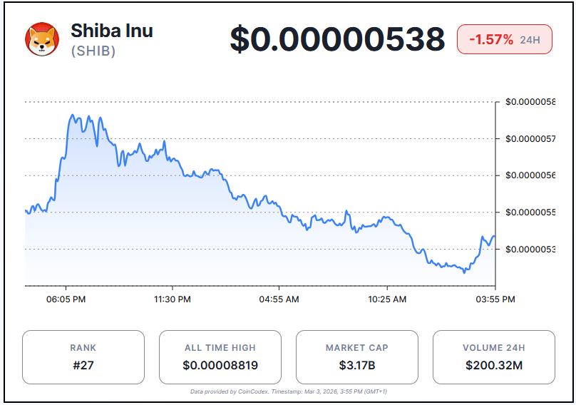 At the time of writing Shiba Inu trades at around $0.00000538, down 1.57% in the last 24 hours.