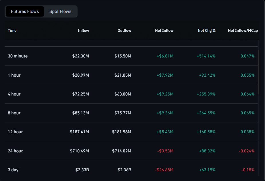 Recent futures flow data shows mixed but active capital movement in the Dogecoin derivatives market. Over the past 30 minutes, inflows sit at about $22.30 million while outflows stand near $15.50 million, leaving a net inflow of roughly $6.81 million.