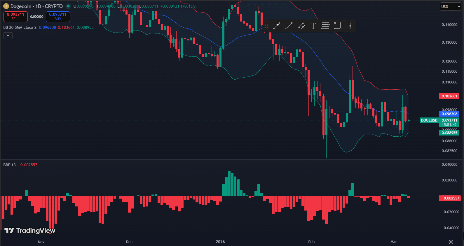 If Dogecoin manages to reclaim the middle Bollinger Band around $0.096, the price could attempt a move toward the $0.103 resistance zone, where the upper band currently aligns.