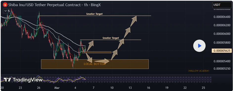 SwallowAcademy’s chart analysis highlighted measured price targets following the successful support retest. The first resistance target stands at $0.00000586. This level matches the intraday high recorded on March 3. At the current market price of $0.00000558, Shiba Inu sits about 5% below that level.