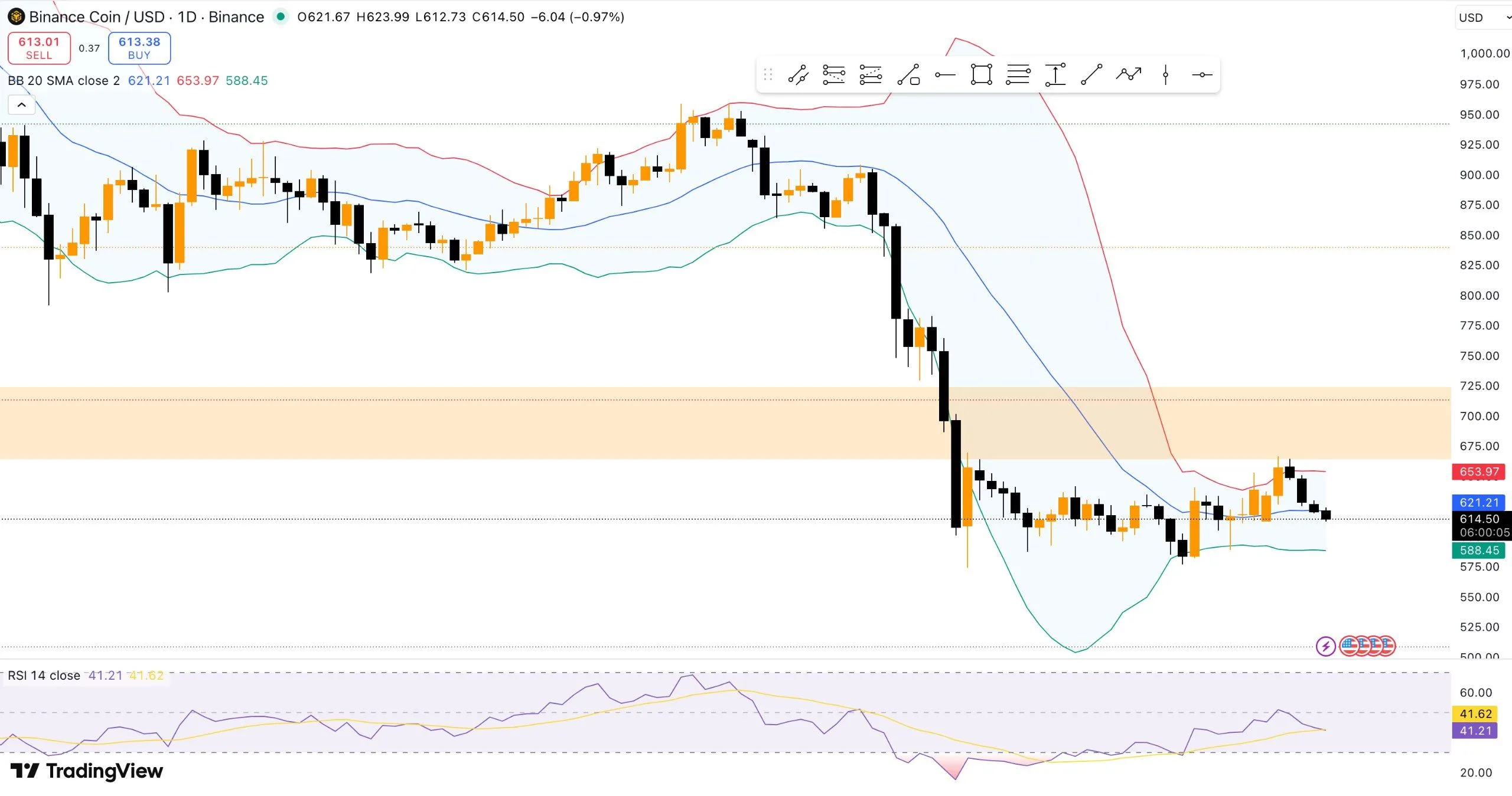 $BNB trades below the 20-day simple moving average near $621. The upper Bollinger Band sits near $653 and acts as resistance. The lower Bollinger Band near $588 offers short-term support.
