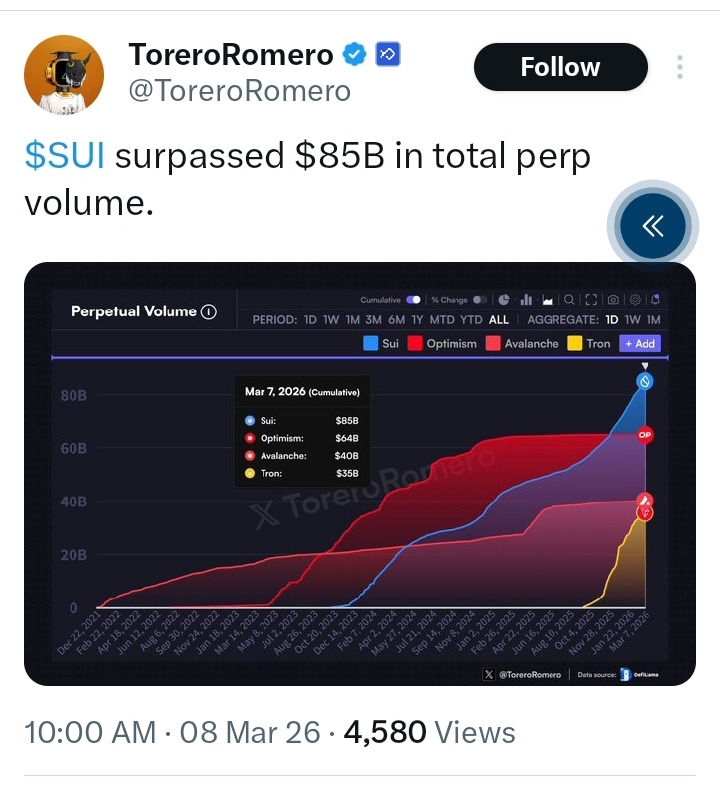 As indicated by on-chain trader and analyst ToreroRomero, the Sui network has officially crossed the $85 billion threshold in cumulative perpetual trading volume, a milestone that underscores its evolution from a high-performance narrative into a mature, financially relevant ecosystem.