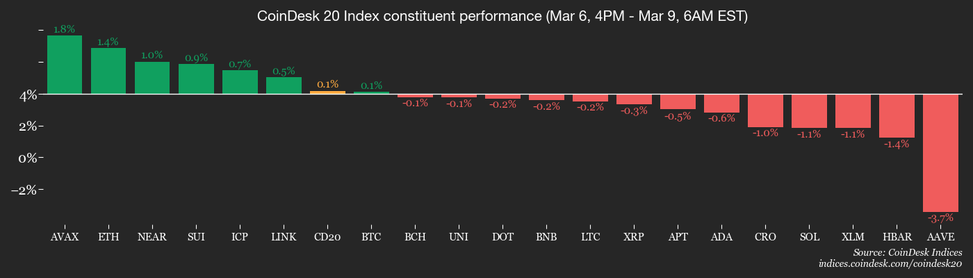 It's solidly within that range at the moment, though. The leading cryptocurrency by market value has risen over 3% since early Asian hours to trade around $68,000. The rally follows a week of back-and-forth action that saw the price rise to nearly $74,000 only to drop back to $67,000 over the weekend. The CoinDesk 20 Index (CD20), ether ($ETH), $XRP ($XRP), solana (SOL) saw similar increases.