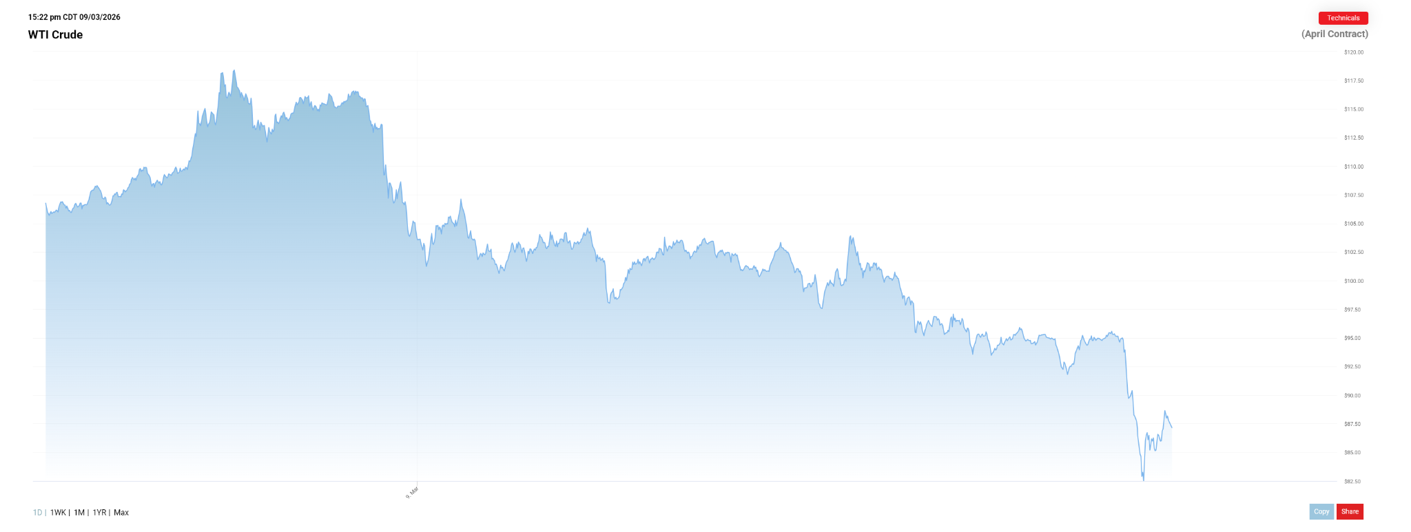 WTI crude fell toward the mid-$80 range after previously trading near $100 and above during the escalation.