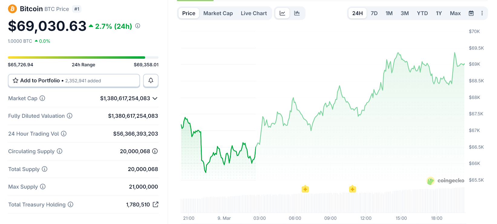 Bitcoin rebounded to around $69,000, gaining roughly 2% over the past 24 hours. The recovery followed earlier volatility as markets assessed geopolitical risks.