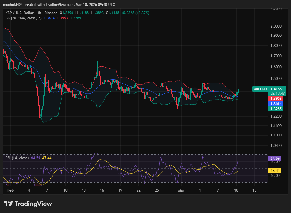 $XRP price has rebounded nearly 5% during the past 24 hours to trade at about $1.40 on Tuesday, March 10, 2026.