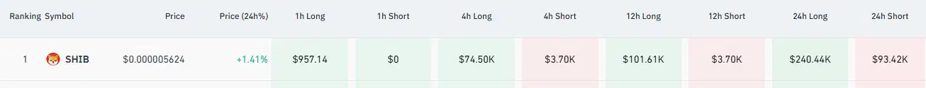 Notably, long traders incurred the majority of the losses. Per the data, long liquidations totaled about $240,440, equivalent to roughly 42.75 billion $SHIB tokens at the current price of $0.000005624. However, short liquidations reached around $93,420, representing approximately 16.61 billion tokens at press time.