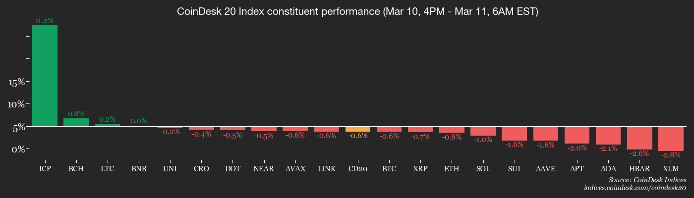 As usual, the disappointment quickly spread from bitcoin to the broader crypto market. Major cryptocurrencies such as ether ($ETH), solana (SOL), $XRP ($XRP), DOGE$0.09213 and $BNB $BNB$637.39 lost 1% or more since midnight UTC, tracking losses in bitcoin. The CoinDesk 20 Index is also down 1% to 1,980 points.