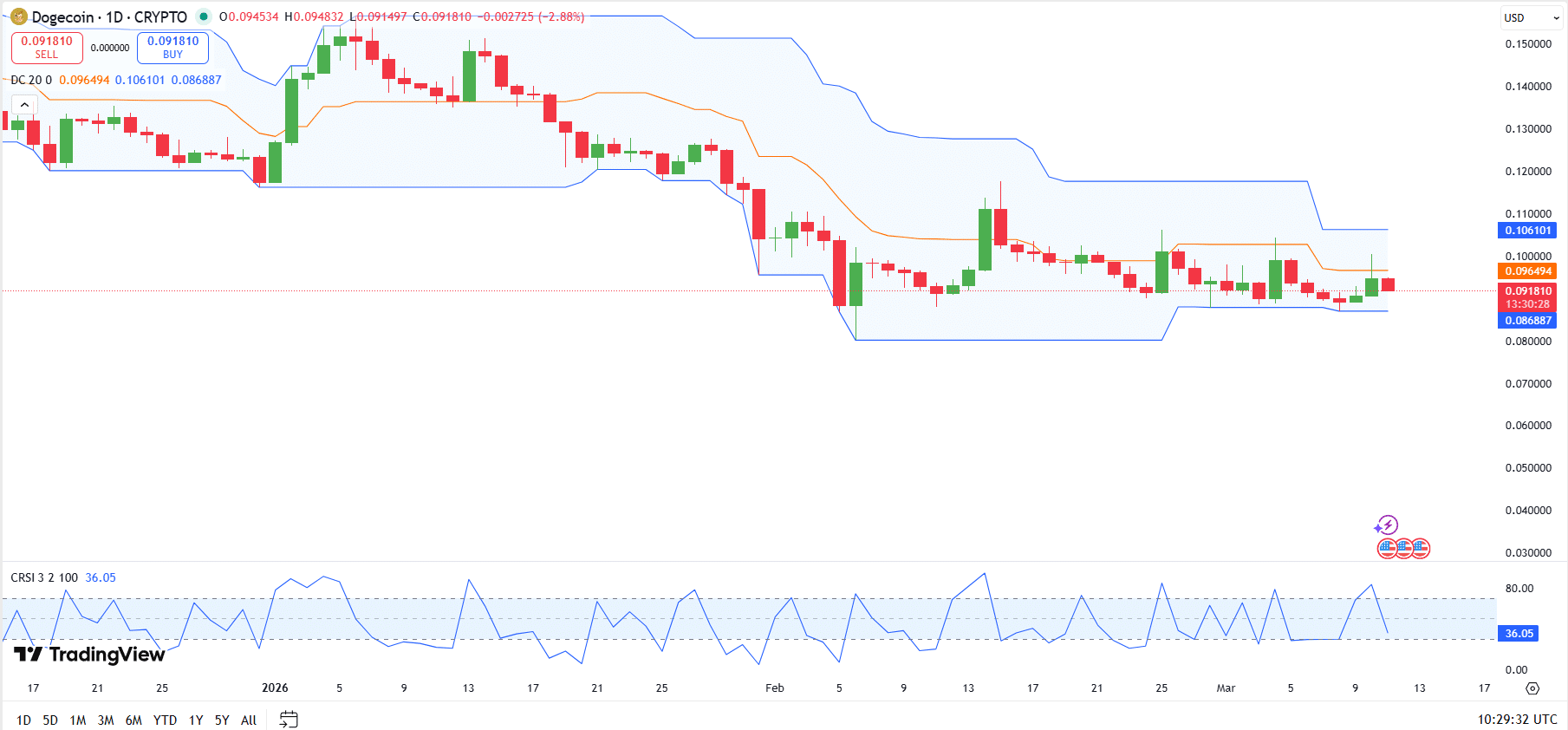Dogecoin’s daily chart suggests overhead resistance remains the main obstacle to any stronger recovery. Price is trading around $0.0918, while the Donchian Channel midline sits above it near $0.0965, and the upper band is much higher near $0.1061.