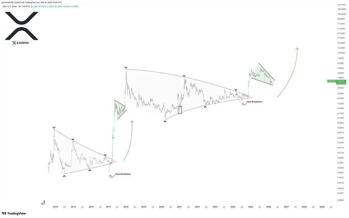 Despite the criticism, the $XRP price has jumped today, with the price witnessing a 7% jump from the 24-hour low to trade at $1.52. Amid this recovery, Crypto analyst Javon Marks has forecasted that $XRP may still be setting up for a major upside continuation, with the price currently trading near $1.50 and the broader structure still supporting a target above $15.