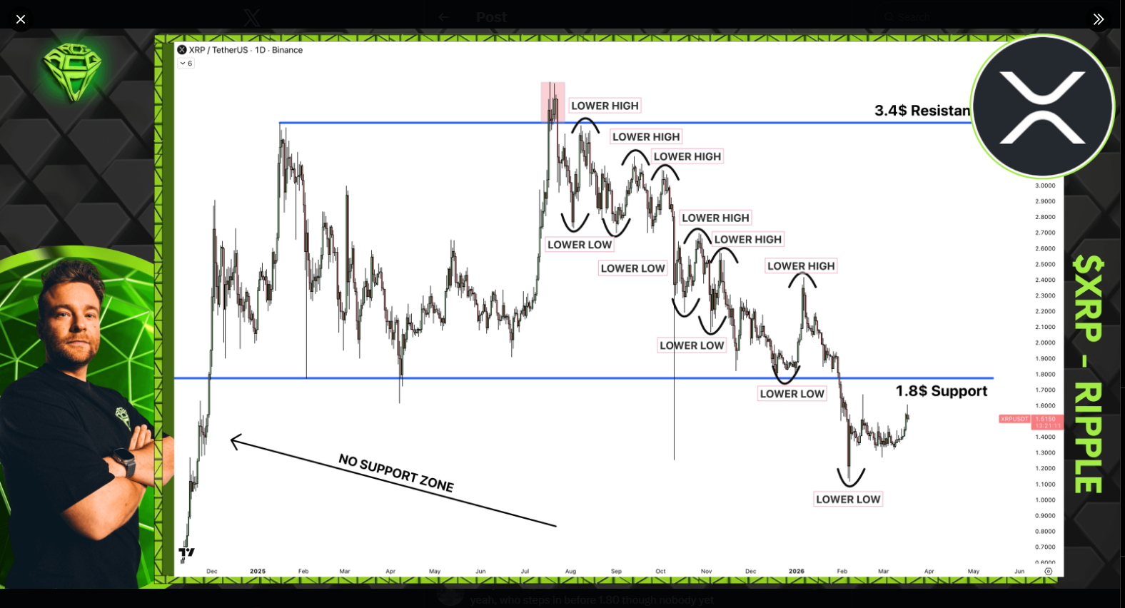 The level he flags on the downside is the $1.20 to $1.30 zone. That area offered no resistance during $XRP’s explosive November 2024 rally, which is what analysts call a “no support zone” — a price range the market blew through so fast that few buyers established positions there.