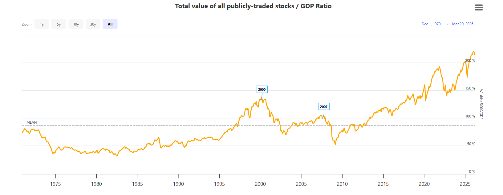 The stock market entered this crisis at stretched valuations. The Shiller CAPE ratio sits at multi-decade highs. The Buffett Indicator has reached roughly 220% of GDP, a level last seen during the dot-com era.