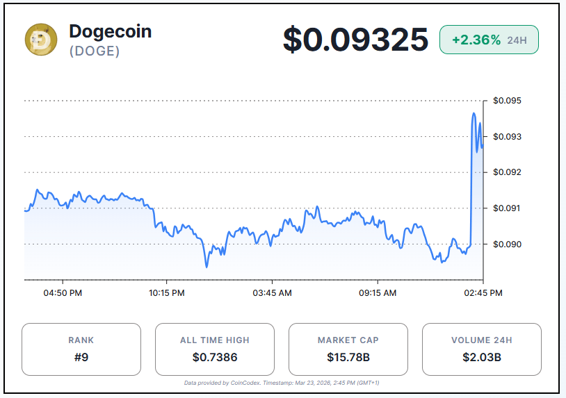 At the time of writing, Dogecoin was trading at $0.09325, with a 2.36% gain over the past 24 hours.