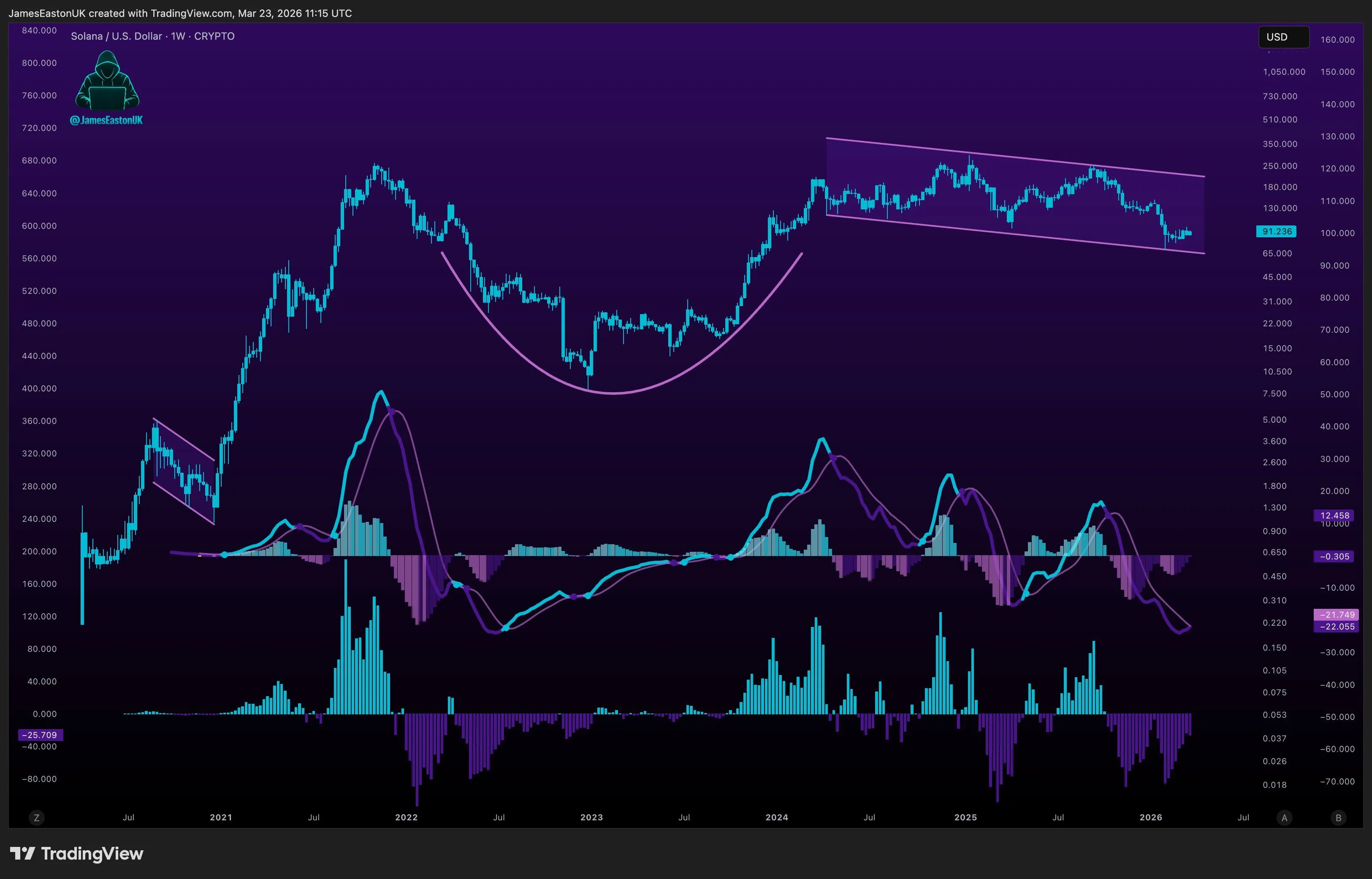 James notes that $SOL’s weekly structure forms a rounded bottom transitioning into a broader uptrend. While short-term momentum appears weak, the macro outlook remains constructive.