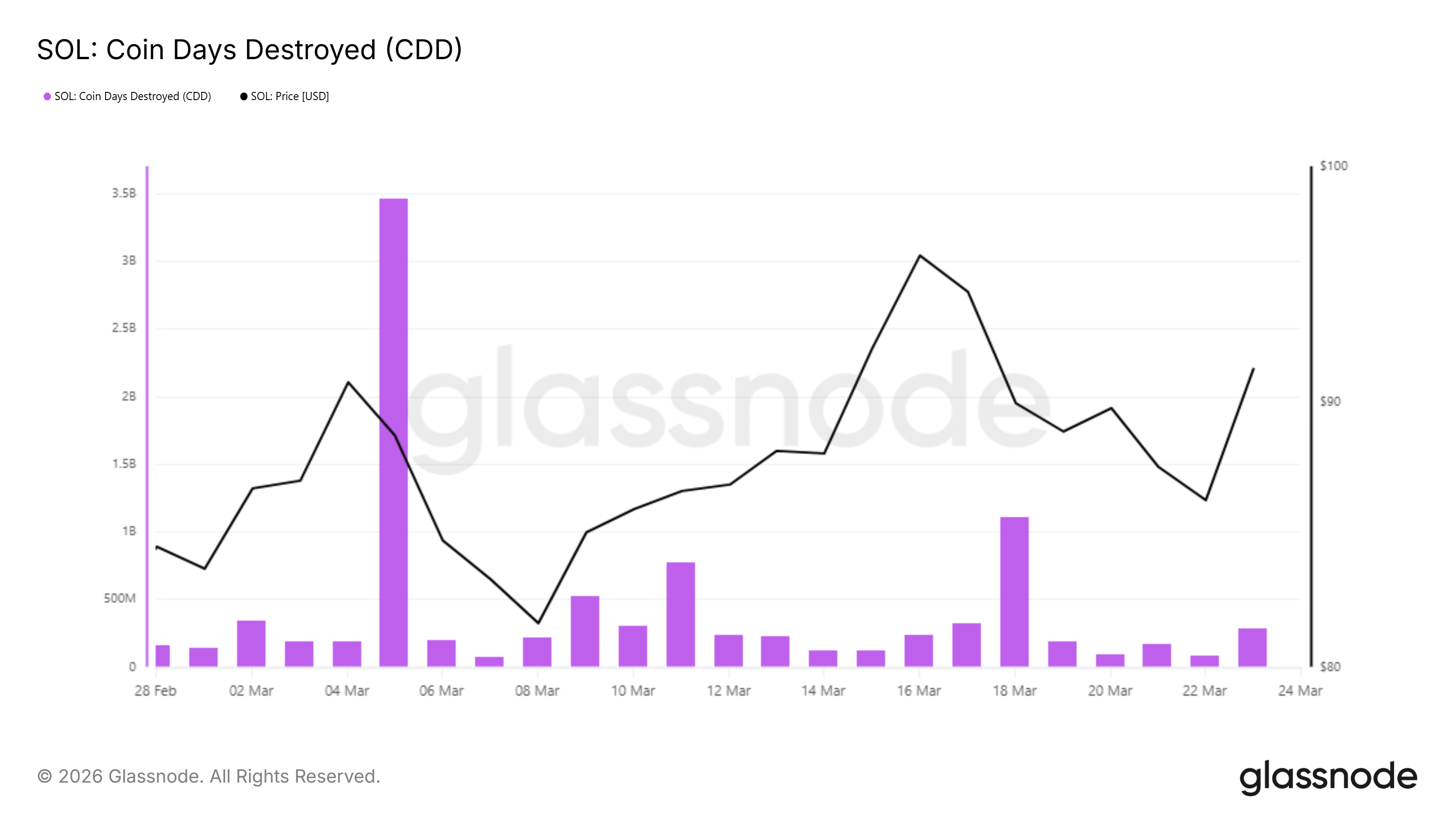 The Coin Days Destroyed (CDD) data is the key input that could change this. The only major CDD spike hit approximately 3.5 billion on March 5, coinciding with the cycle low — old $SOL coins moving during maximum fear. Since then, CDD has returned to routine readings of 100–300 million per day, with no new spike on March 24. Long-term holders are not distributing, which keeps one layer of sell pressure contained.