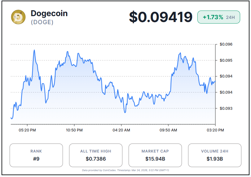 As of writing, Dogecoin was trading at $0.09419, up 1.73% over the past 24 hours.