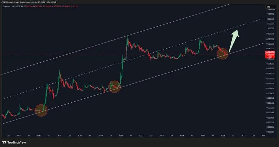 The trend remains intact, with higher lows continuing to form within the channel. The current rebound from around $0.087 mirrors past cycles that led to strong rallies. Analyst CW on X highlights this repeating pattern across previous price actions. Holding above this support keeps the bullish outlook firm. If momentum strengthens, the price could push toward $0.12 and beyond. Sustained buying pressure may eventually drive a move toward the channel’s upper resistance.