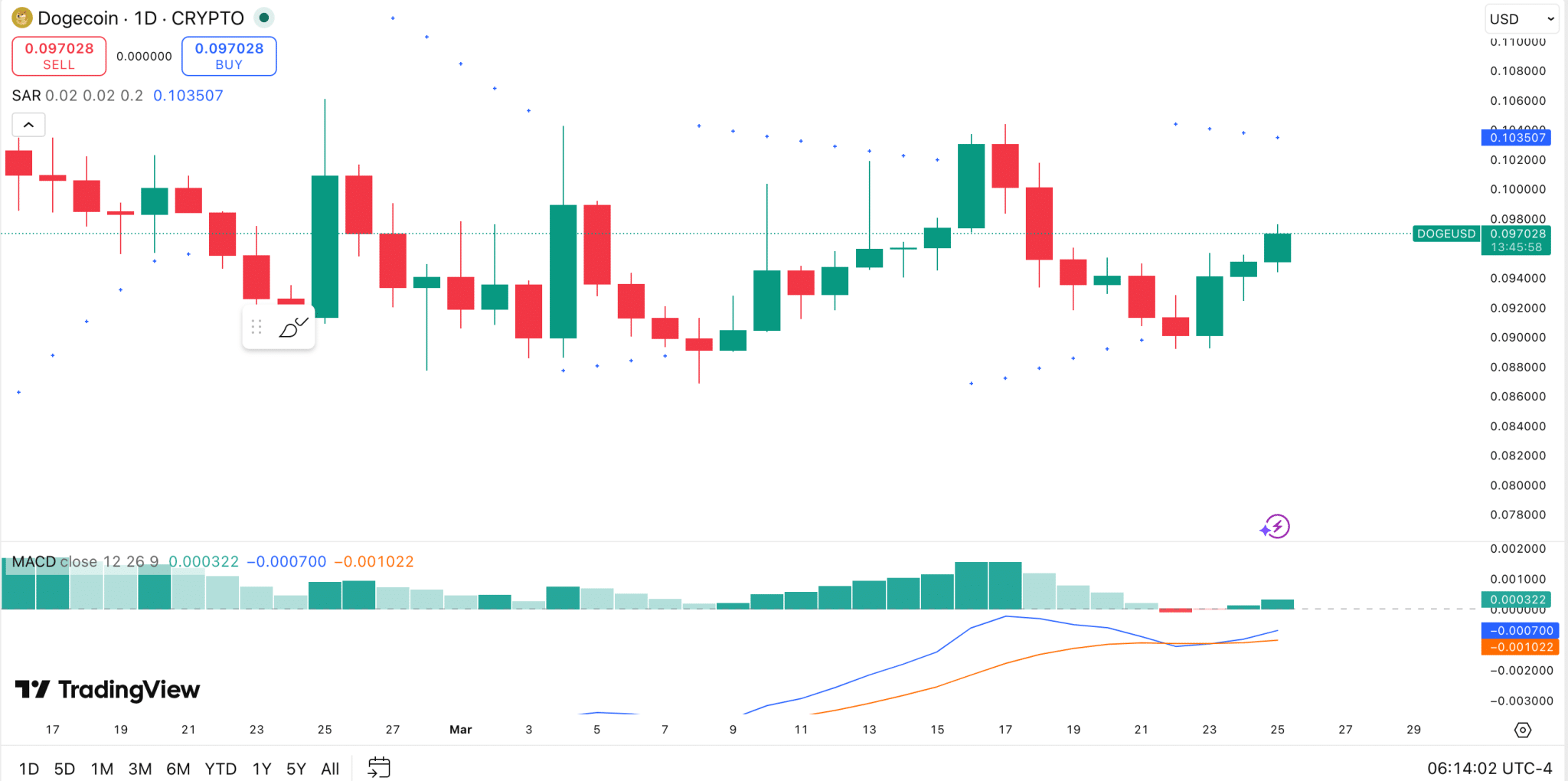 Dogecoin’s daily chart shows a modest recovery, with $DOGE trading above $0.09 after rebounding from the $0.089 area. The recent candles suggest buyers have regained some short-term control, but the Parabolic SAR still sits above the price at around $0.1035.