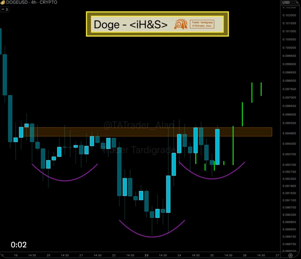 On the social media commentary end, Trader Tardigrade said Dogecoin’s 4-hour chart is showing a constructive setup, with the price action forming the right shoulder of an inverse head and shoulders pattern.