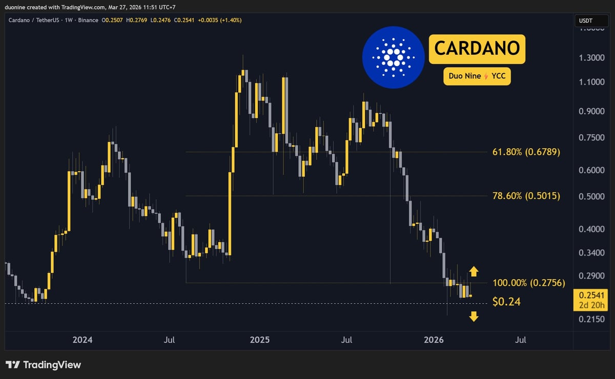 $ADA is also down 6% this week after failing to move above the $0.28 resistance level. Sellers returned to push it lower toward the key support at $0.24.