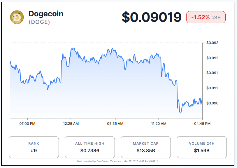Dogecoin dropped 1.52% in 24 hours, pushing prices to roughly $0.09019 as the broader crypto market shed 3% to land below $2.4 trillion in total capitalization. The sell-off is measured, not panicked, but the structure underneath $DOGE's price action is fragile enough to demand attention.