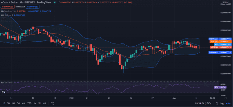XEC price analysis appears to follow a somewhat uncertain trend as the market remains bearish. However, the market volatility seems to decrease, making the cryptocurrency less prone to volatile change. The upper limit of the Bollinger’s band is at $0.00007993, which serves as the strongest resistance for XEC. Conversely, the lower limit of the Bollinger’s band appears to be at $0.00007229, serving as the strongest support for XEC.