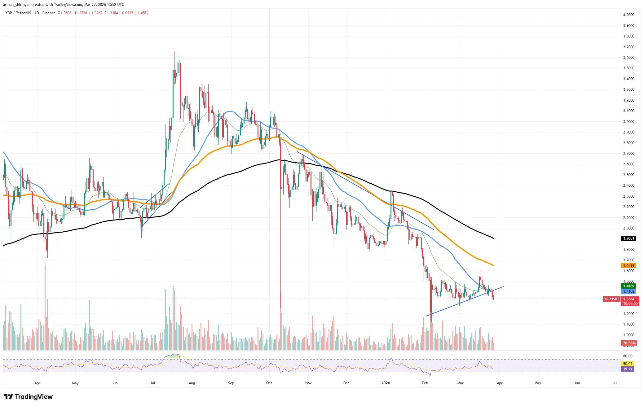 $XRP is getting close to a crucial technical point, where what appears to be a downward trend could actually turn into a traditional bear trap. The asset’s price is currently in the $1.30-$1.35 range, having compressed into a tight structure close to the lower edge of its 2026 range. Ethereum, on the other hand, is actively defending the critical $2,000 level that, if broken, will start a spiral that will lead us to nowhere.