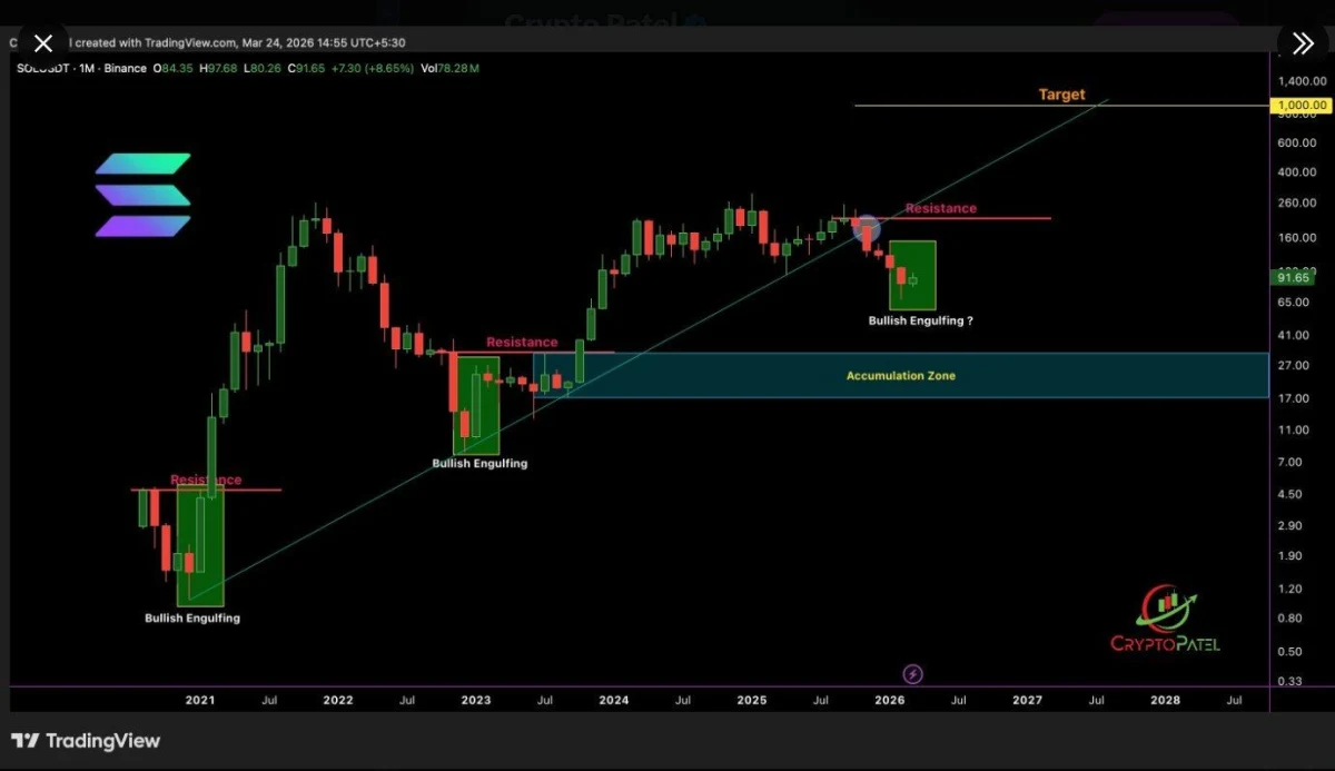 Market reports also point to a recurring monthly bullish engulfing pattern that has appeared before earlier Solana rallies. Analysts note that the pattern is not yet fully confirmed, but it remains under watch as the month develops.